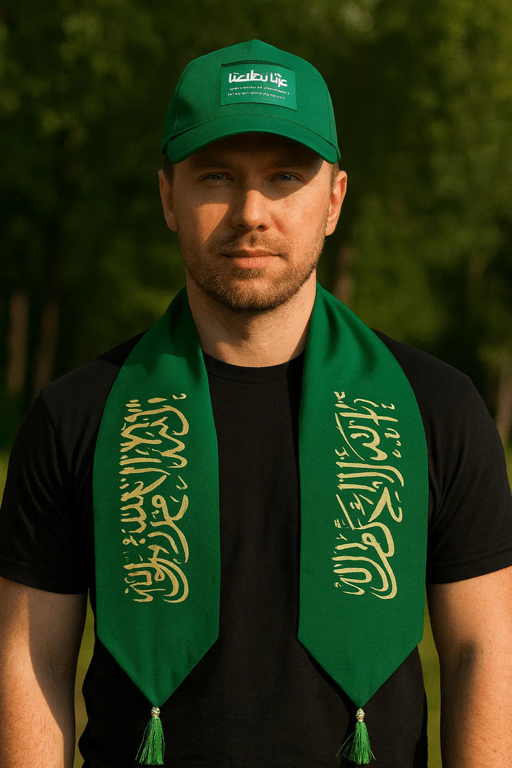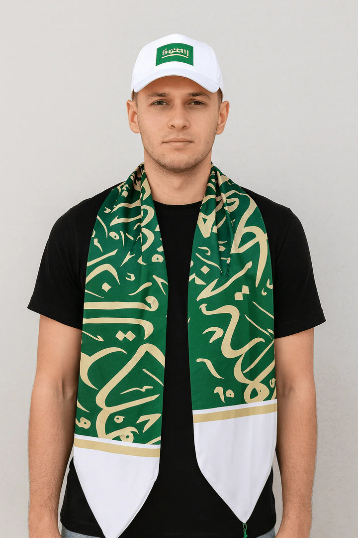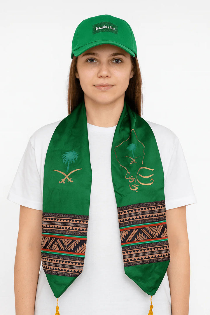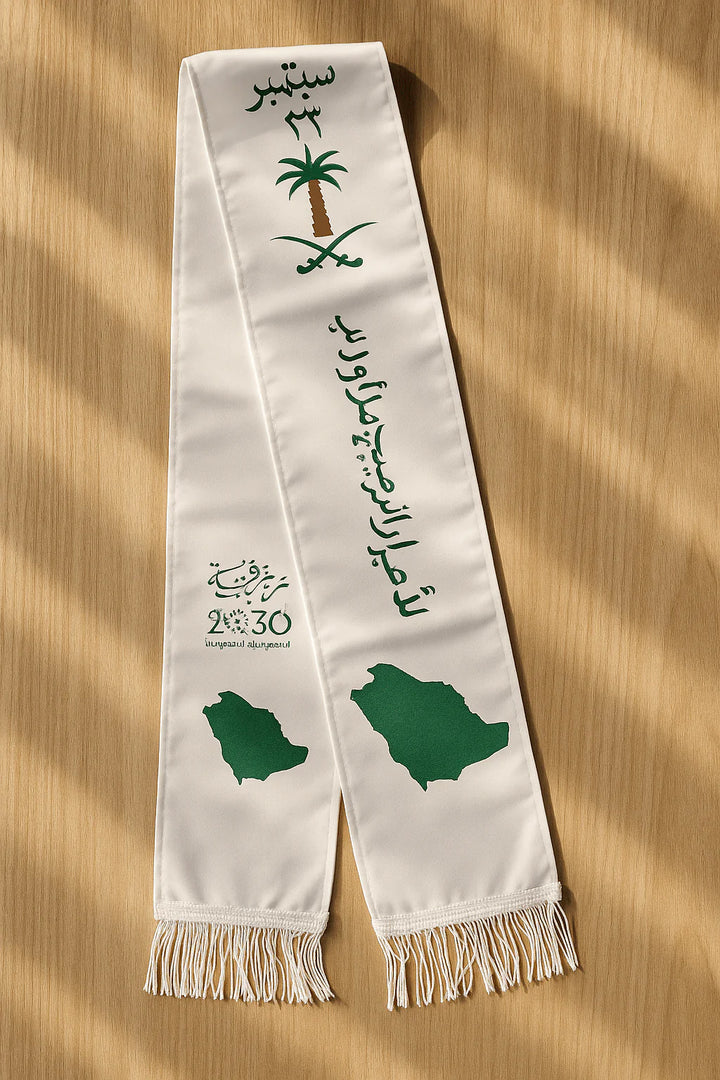 Saudi National Day Heritage Sash – A green and white scarf adorned with golden Arabic calligraphy celebrating the Kingdom’s unity.