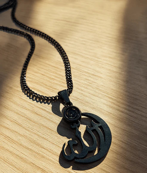 ✔ Arabic 'Allah' calligraphy pendant – Beautifully crafted pendant shaped in stylized Arabic script, symbolizing faith and devotion.