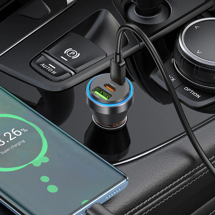 Hoco NZ12D 60W Car Charger Set – A powerful 3-port fast charger for vehicles, supporting USB-A and USB-C outputs with included cables for both Type-C and iPhone devices.