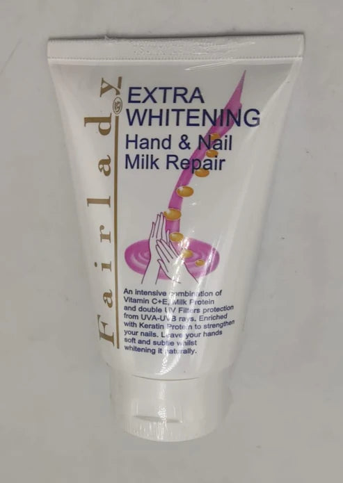 Fairlady Extra Whitening Hand & Nail Milk Repair – A nourishing hand lotion enriched with Milk Protein, Vitamins C+E, and Keratin to soften skin, strengthen nails, and visibly brighten hands with daily use.