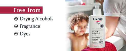 Eucerin Baby Wash & Shampoo – A gentle 2-in-1 formula designed for delicate baby skin and hair, enriched with Pro-Vitamin B5 and shea butter to cleanse without drying or irritation.