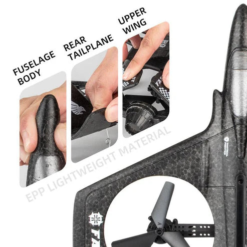 Key Materials/Features: 2.4GHz RC, 360° stunt flips, headless mode, auto return, dual fan propellers, fixed wing style