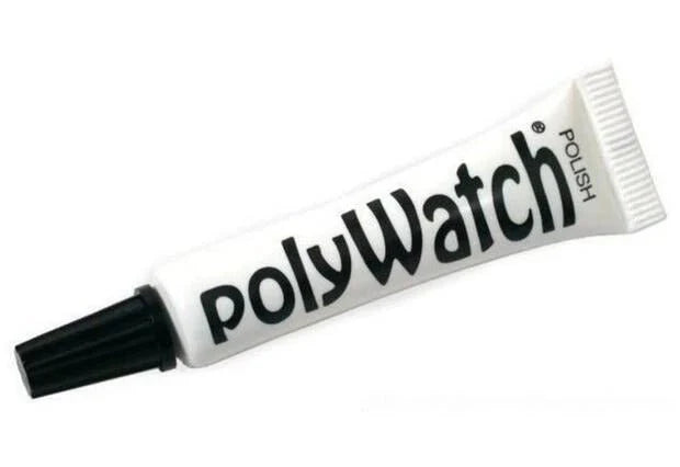 Apply polywatch to plastic watch glass. Use a piece of lint to wipe the scratched area under pressure for 2-8 minutes. Severe scratches must be stepped on more than once.